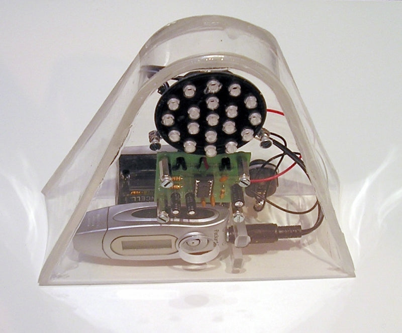 This MP3 amplifier was styled using a metronome as a starting point. The clear perspex has been hand cut and over bent to give this interesting appearance.