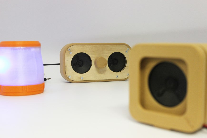 This resource has been designed to show how you can use our Mono and stereo amplifier module kits as the basis for a 3D printing project. Speaker cases are a great size to still print relatively quickly, but also allow for more detailed exploration in the design and assembly of multiple parts. Below is a selection of pictures showing some of the example designs that we have created.