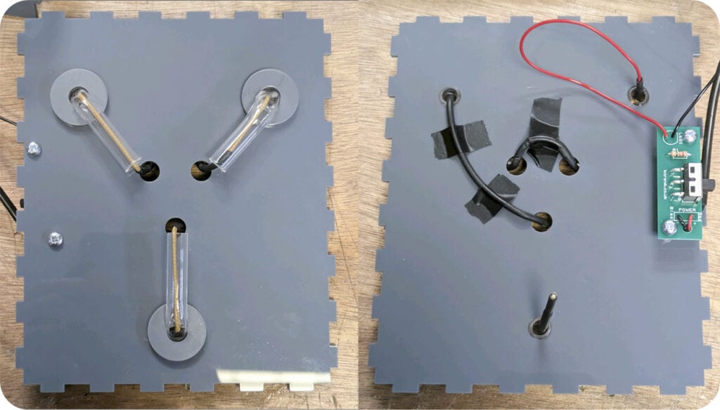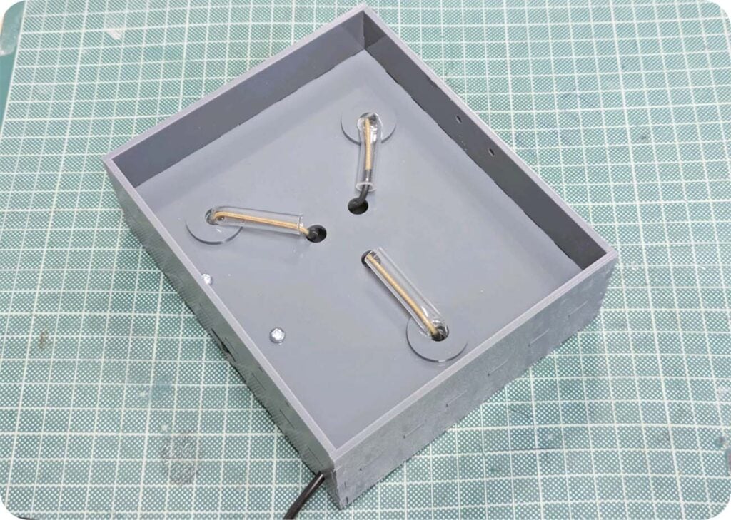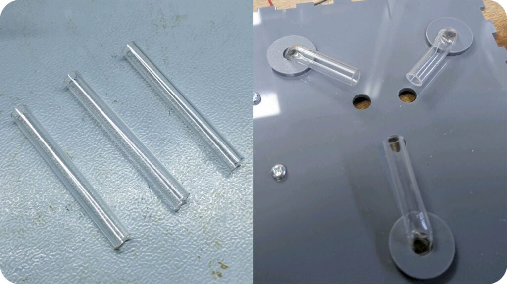 Cut 3 lengths of the acrylic tube approximately 5cm each, then one at a time heat one end of the tubes gently with a heat gun, line bender or other acrylic heating device, and feed them up through the holes in the internal panel and bend it so that they lay horizontally against the internal panel as shown.