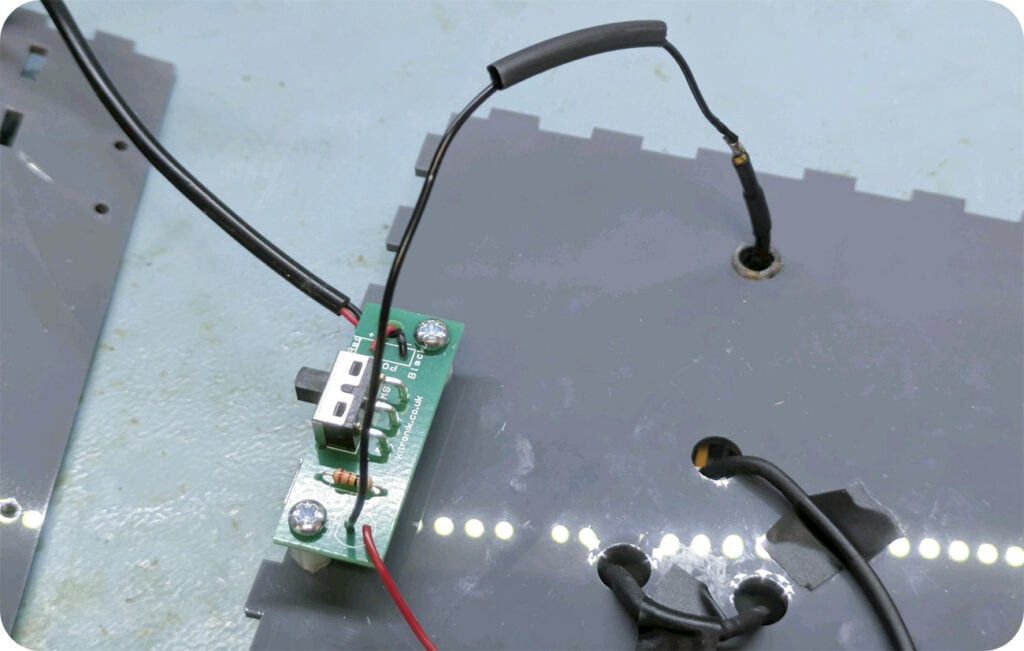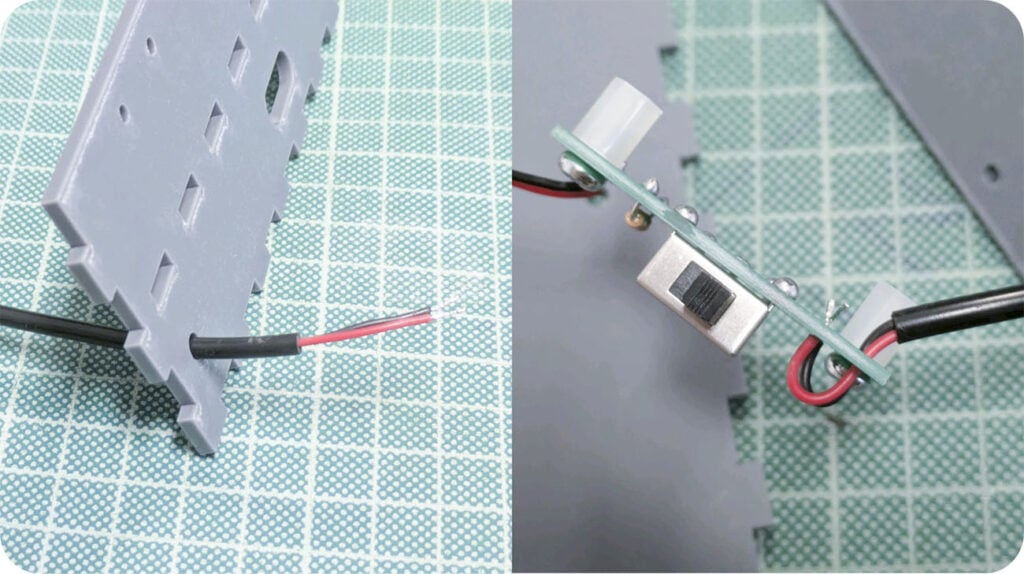 First, feed it through the hole in the bottom of the panel with the hinge screw holes and switch hole, then solder to the PCB, making sure to pass the wires through the strain relief hole before doing so.