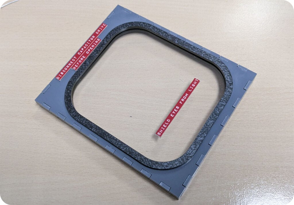 As shown, build the lid, using the black “rubber seal” pieces to suspend the window in place, and using superglue sparingly to secure all pieces in place except the labels. These should be attached with double-sided tape to avoid misting on the window.