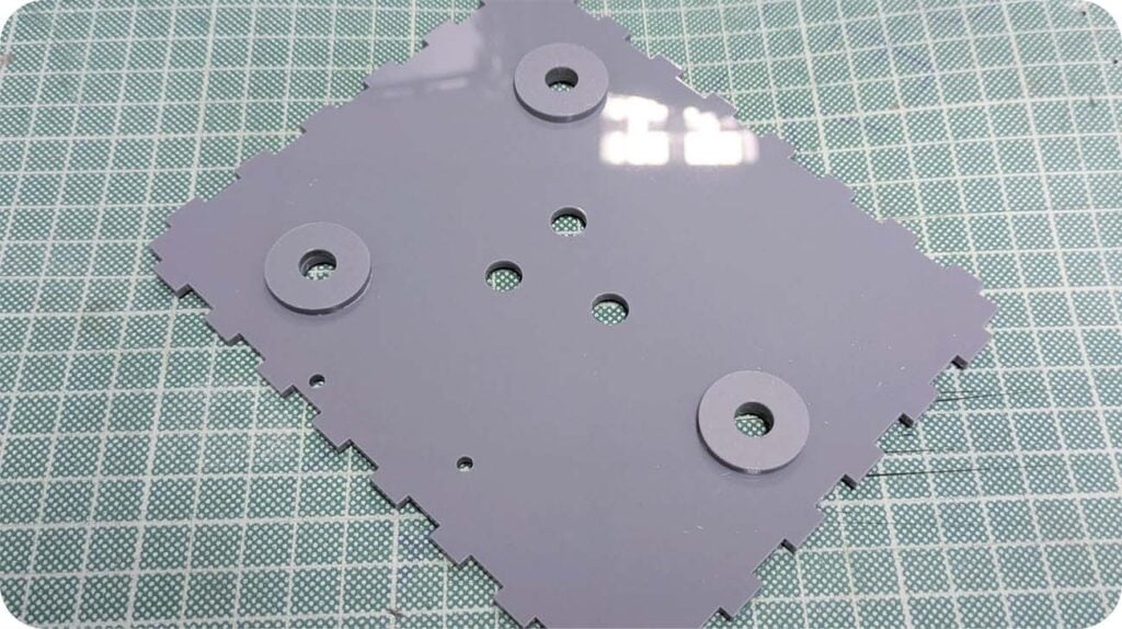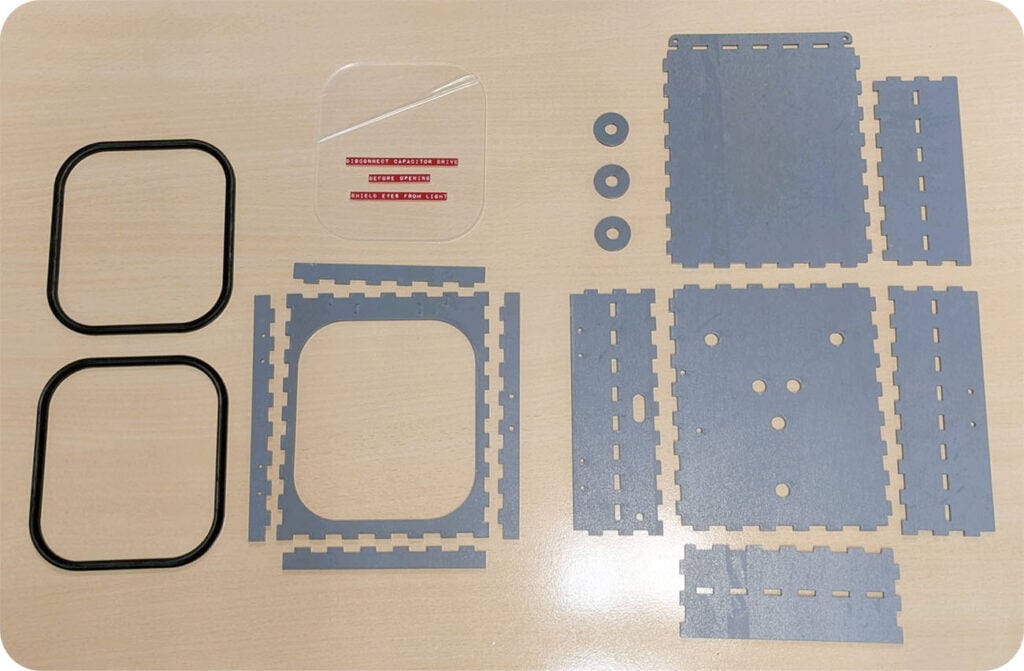 We’ve cut the enclosure from 3mm thick Grey Value Acrylic, Black Value Acrylic, Clear Value Acrylic, and then the engraved labels were made using Red on White Laser Laminate.