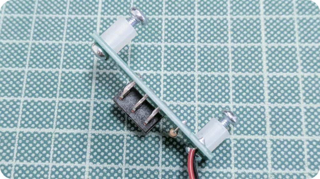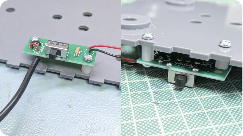 Using the last two 6mm M3 pan-head screws, affix the PCB to the bottom of the internal Panel, with the switch facing the outside edge of the panel.