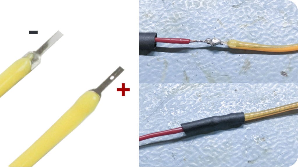 To complete the circuit, slide a length of heat shrink on to the black LED wire, then solder the other side of the noodle (the tab on this side has no hole in it) onto this wire. Then slide the heat shrink over the solder joint and shrink it in place gently.