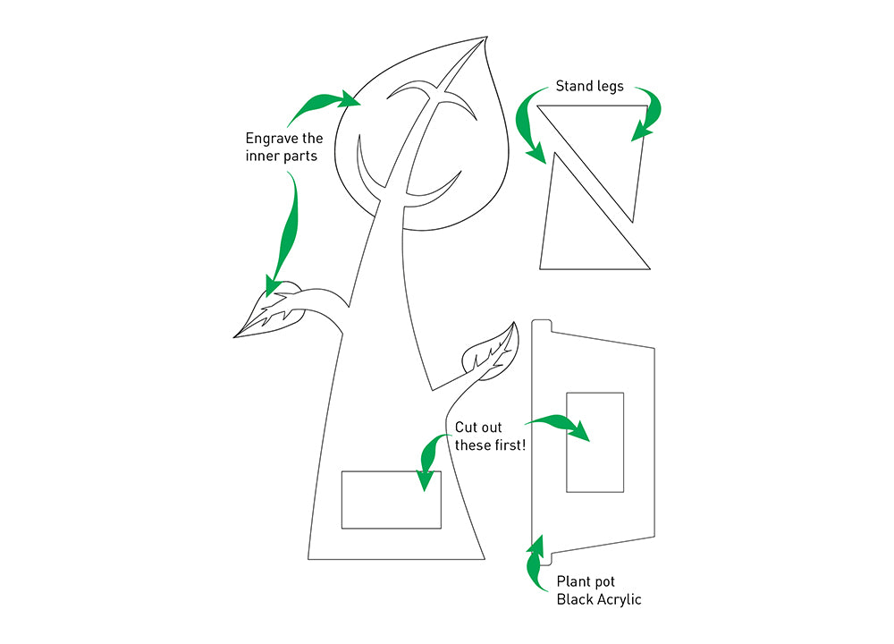 Engrave and then laser cut your plant in the Green acrylic followed by your Plant pot in the black (don’t forget to print the stand legs!). Be sure to cut out the holes for the module to sit, first.