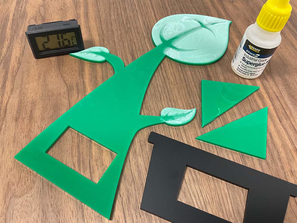 Clean off any particles made by the engraving and glue the pot to the plant, aligning the hole for your temperature module. Once set, glue the stand legs to the back of the plant.