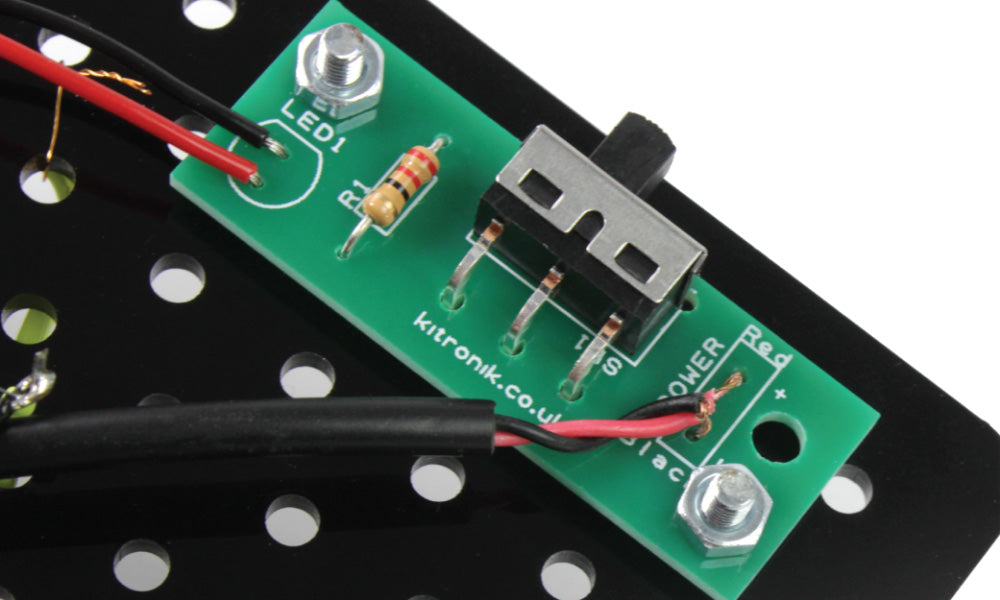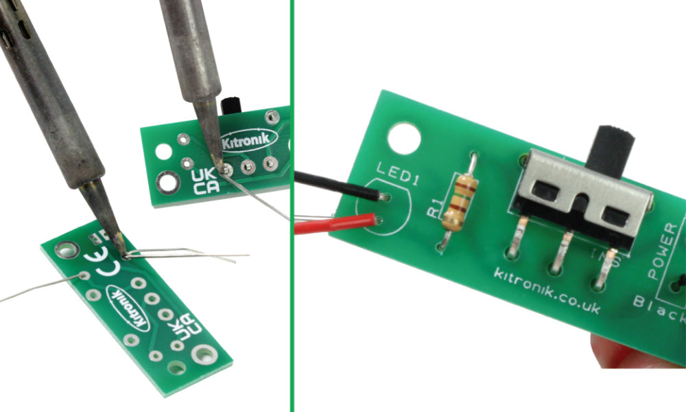 Solder on the switch, the resistor, the USB lead and the separate red and black wires. Use these notes to help you!