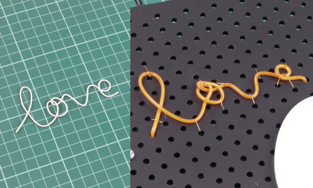 To secure the shape, we used small lengths of copper wire and looped them over the noodle, through two holes on the pegboard, and then twisted the ends on the back of the pegboard like a twist tie. The best positioning for these ties is at the apex of curves or corners in your design.
