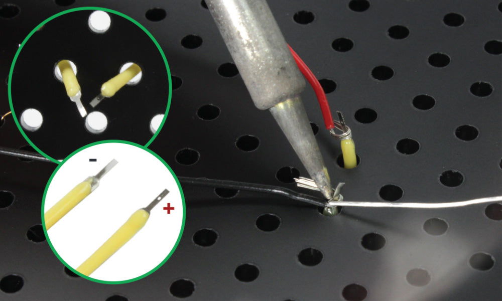 Note: The black wire will be the negative wire, and will therefore be soldered onto the pad closest to the flat edge of the LED outline.