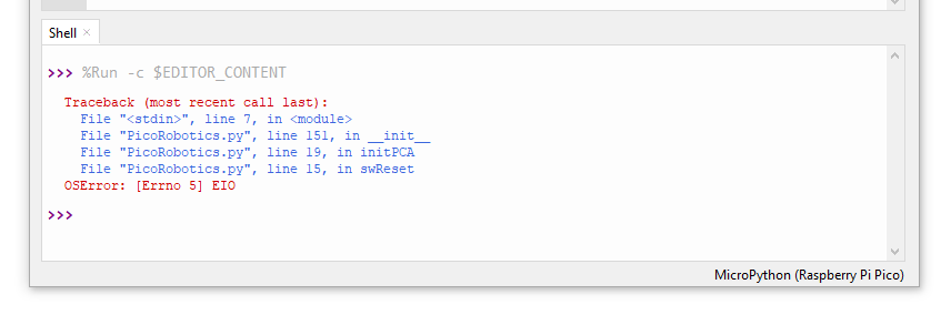 This error appears in the Shell window when the Pico is trying to talk to an I2C device, and the device does not respond. It is most likely to be seen when using the Kitronik Robotics Board for Raspberry Pi Pico. The most likely cause of this error is that the robotics board is not powered on.