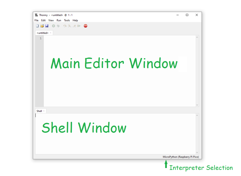Thonny has 2 main areas – an editor window – were you can type and edit code and the Shell window – which reports back messages from the Pico. You can type code into the Shell window, but we will not cover that in this guide.