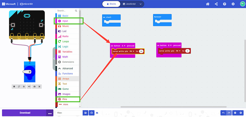 Method One – Coding 180 degree servos in the MakeCode Simulator: