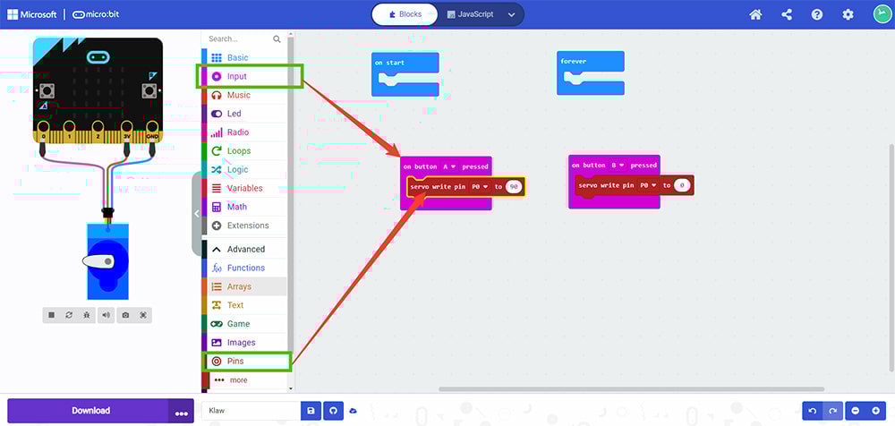 Method Two – How to write code for the Kitronik Klaw: