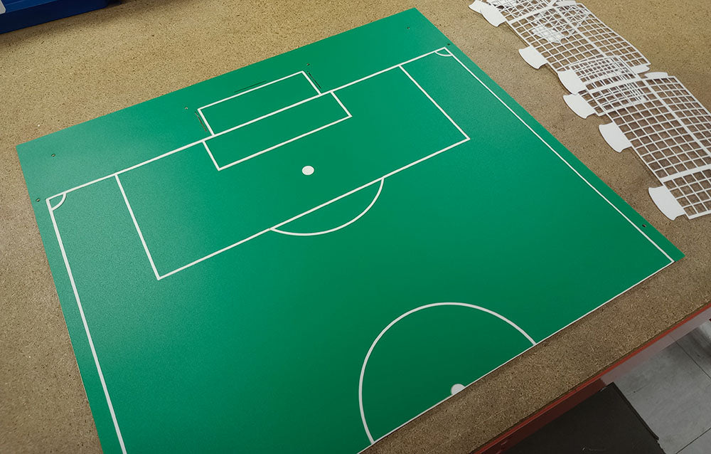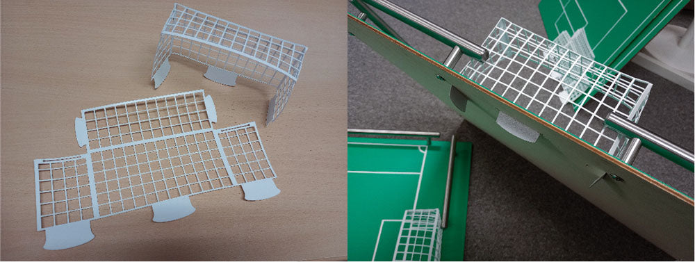 Now, your goal posts! The DXF does feature a flared tab at the bottom, however when it came down to it we cut off the flares since they wouldn’t properly fit through the plywood. Folding your goals into shape, insert the tabs at the top on each side to secure it in place. Then push the bottom tabs through the slots in the pitch, fold the tabs over on the back, and tape in place.