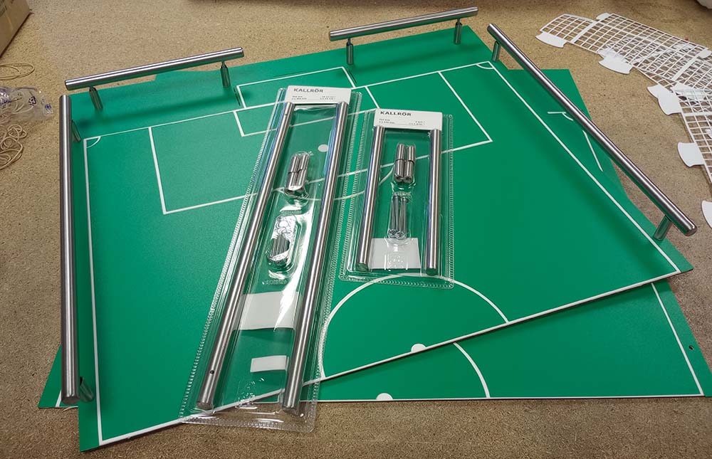 This is the best hack for making small fences we have found: cabinet handles! We used this to keep our buggies on the table at BETT and it’s such a clean look that we keep using it! Using IKEA KALLRÖR handles in 405mm and 213mm we have simply screwed in the handles through the pre-cut holes. If you want to use different handles you will need to customise hole width and placement yourself to suit your chosen handles.