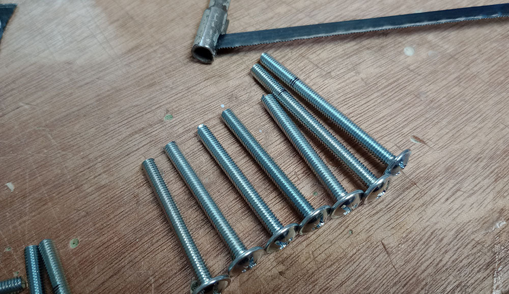 In the previous image it is possible to see that the included screws were a little too long since they are made to go through thick cabinets, rather than 4mm Poplar Plywood. To fix this, we sawed down the length to make the fit of the handles flush.