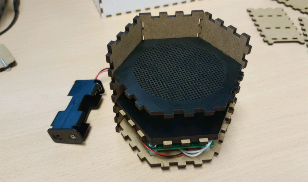 Three sides can now be pushed onto the bottom hexagonal panel. Use PVA glue to secure the finger joints in place.