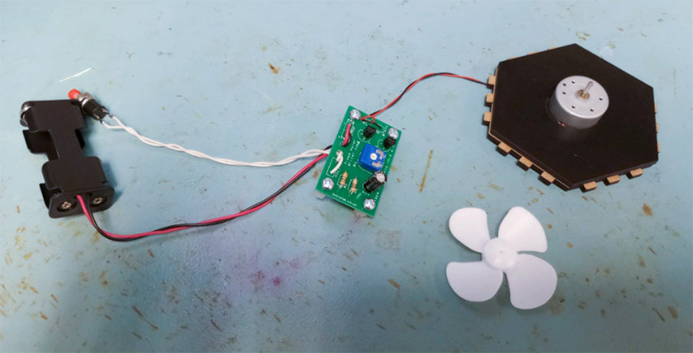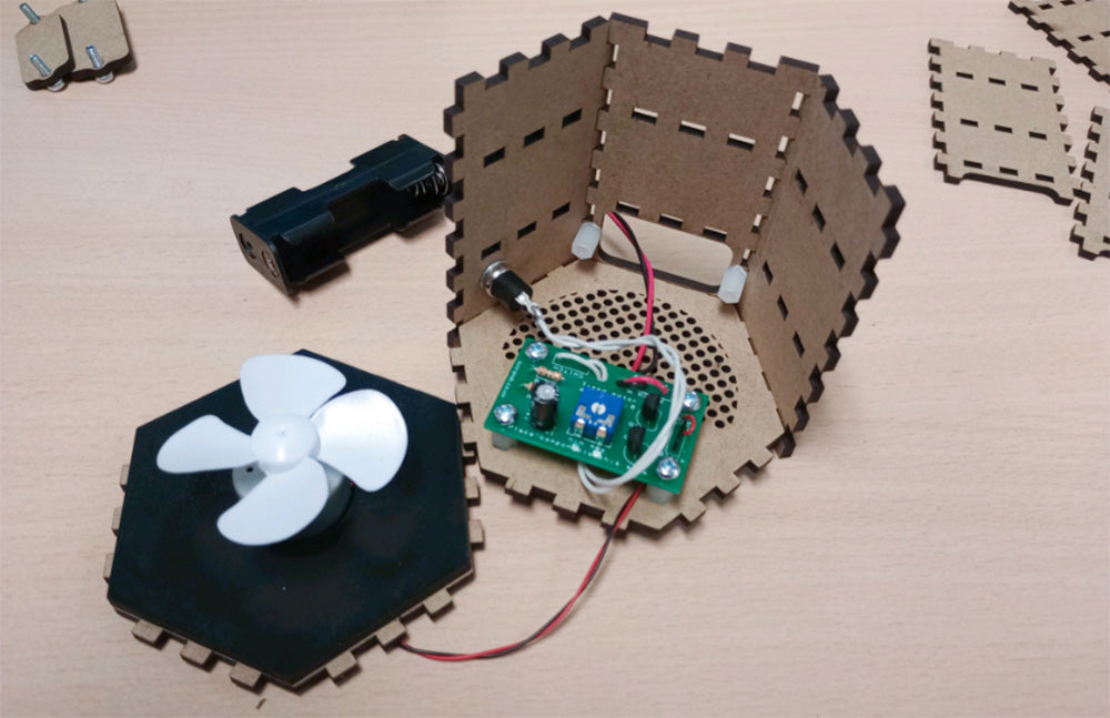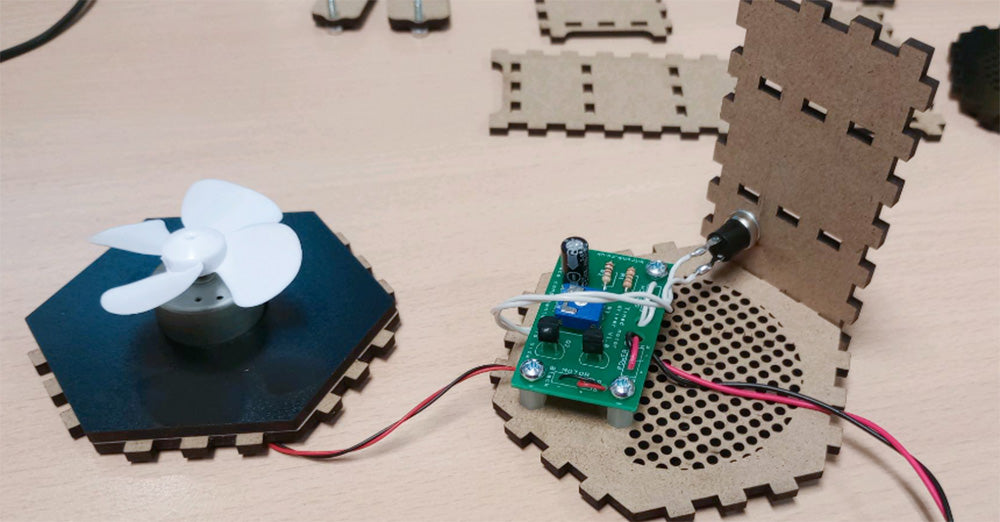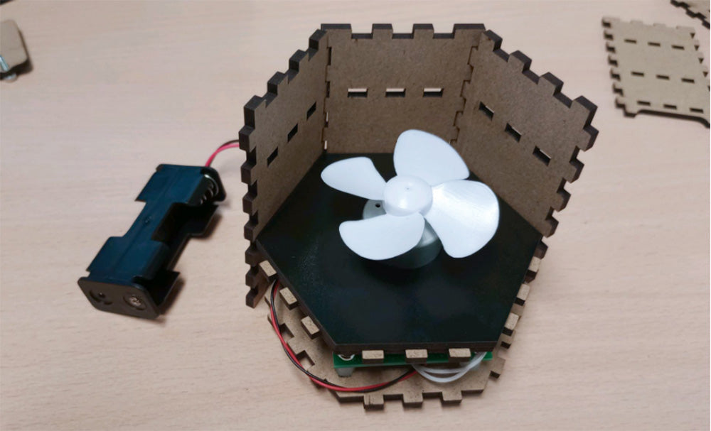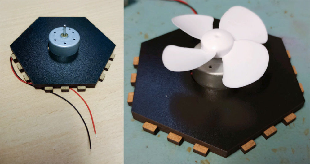 Glue the two panels shown together using PVA glue. Once the glue is dry, thread the motor wires through the small hole, then push the motor into the circular hole. Finally, push the fan onto the motor.