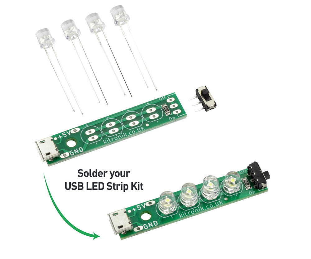 Solder the USB LED Strip Kit together. The kit build instructions can be found here.