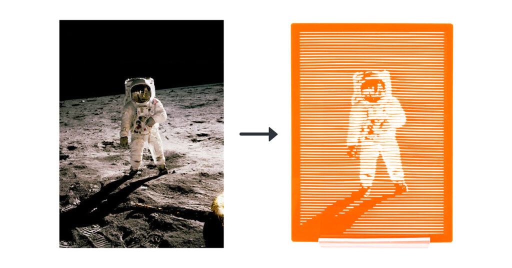 The design we have chosen is a photo from the Apollo 11 mission, owned by NASA and taken by Neil Armstrong, depicting Buzz Aldrin on the surface of the moon, with the Lunar Module and Neil both reflected in his visor. This felt suitably retro-futuristic, and therefore suitable as a design choice for the fluorescent acrylic.