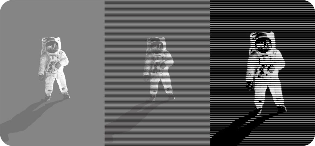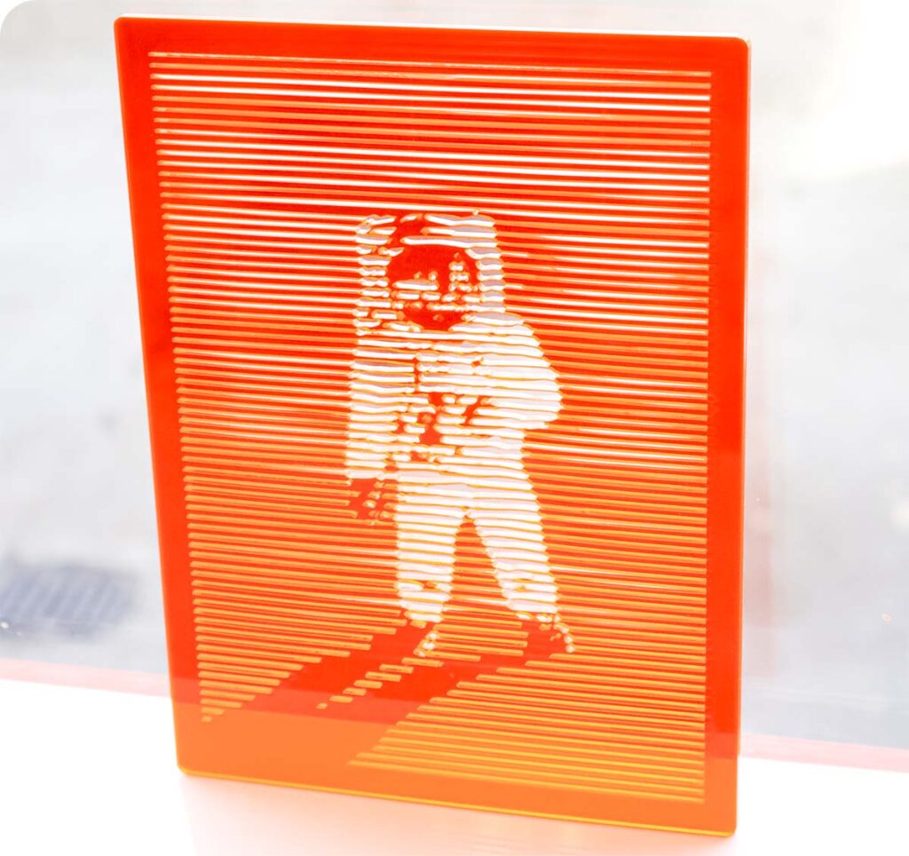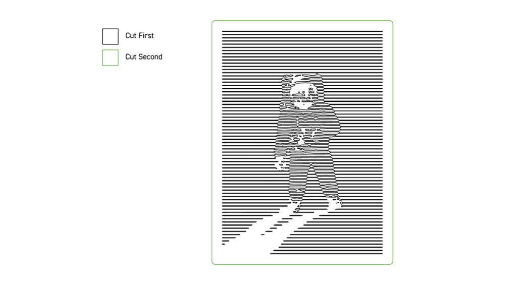 Note that we have cut out Buzz and his shadow and applied a mid-grey to the background in order to raise the contrast, and in the final image we decided on larger black bars and a closer zoom on the subject – this simplifies the design and makes sure that it will hold up when laser cut, and there aren’t any slim lines that will be fragile.