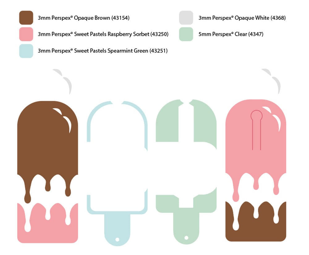 We’re on our way towards summer, so our latest make is an icon of the season – an ice lolly! This fun enclosure for our new Keyring Torch (35160) shows just how effectively different acrylics can work together, and also how a simple design can make brown perspex look absolutely delicious! The shine on the show face gives it the look of chocolate sauce, which is exaggerated when it’s next to the matt pastels.