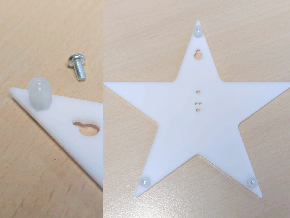 Using 3 6mm M3 Pan Head Screws, we secured 3 plastic Spacers into the holes in three of the points of the star. These will hold the front panel over the back panel.