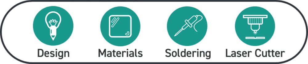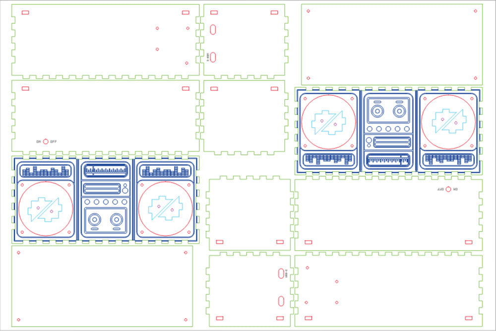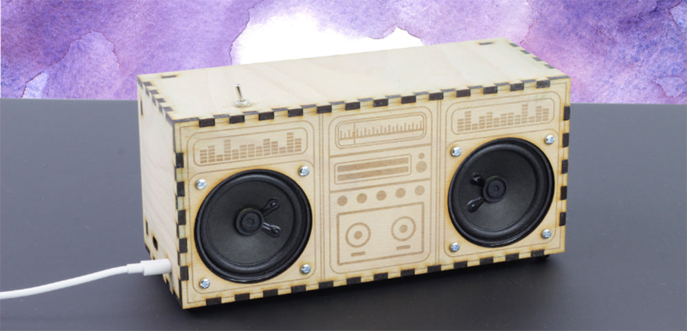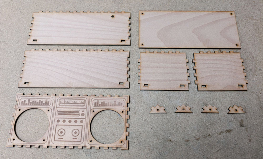 Our design will look as below when cut, all from a single piece of Steamed Beech Veneered MDF. Our design features an engraving of a retro boombox, though you do not have to keep this design.