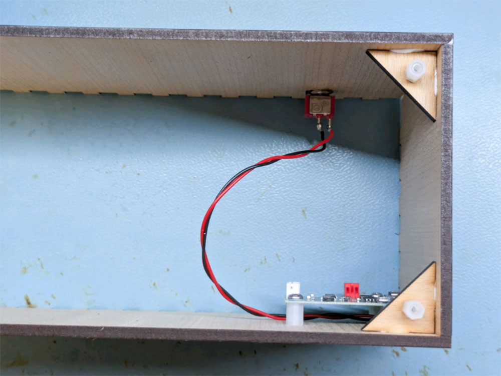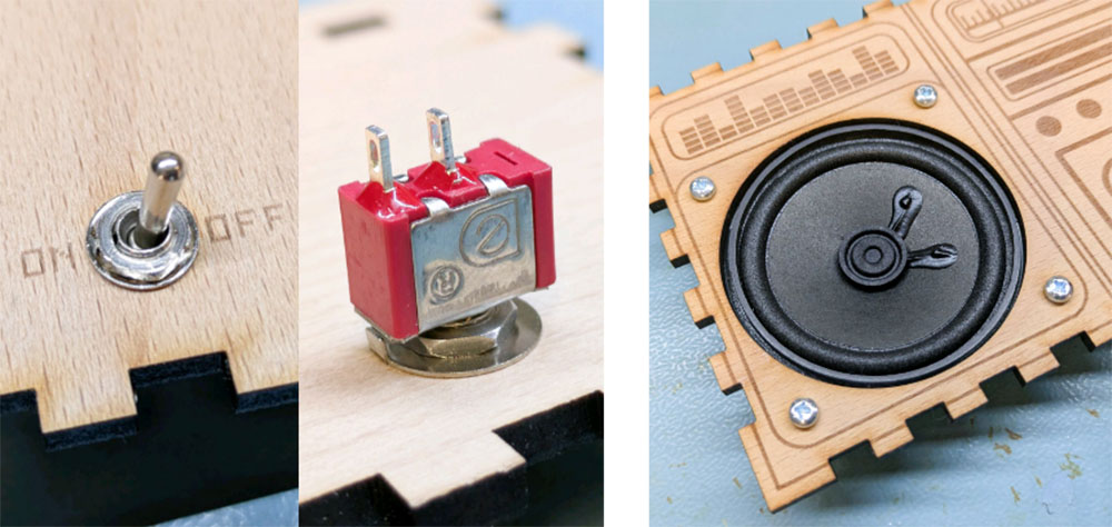 The switch is mounted using the included washers and hex nuts, and the speaker we have mounted using four 10mm M3 pan-head screws and four nuts.