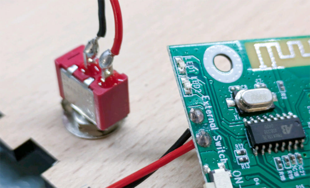 The Bluetooth Amplifier Kit was updated with external switch pads at the beginning of 2025, and we will be using these to add our toggle switch. Solder the switch on as shown in the image below, with each contact on the switch connected to one of the two pads with a wire.
