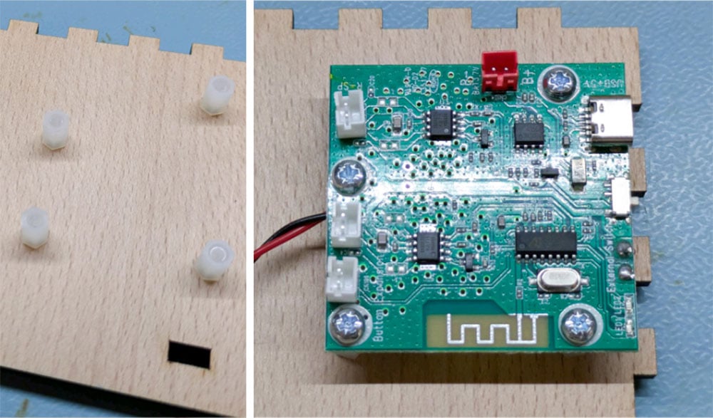 Screw the PCB onto the bottom panel (which has four unevenly spaced holes) as shown in the image. Fix a spacer to each hole using a 6mm pan head screw from underneath the panel, then another of the same screw can be used to screw the PCB to the spacers.