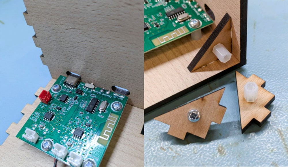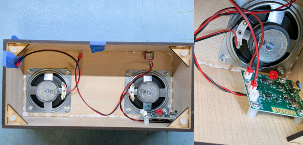 - The PCB should be mounted in a position central to both speakers, so the wires can reach it.