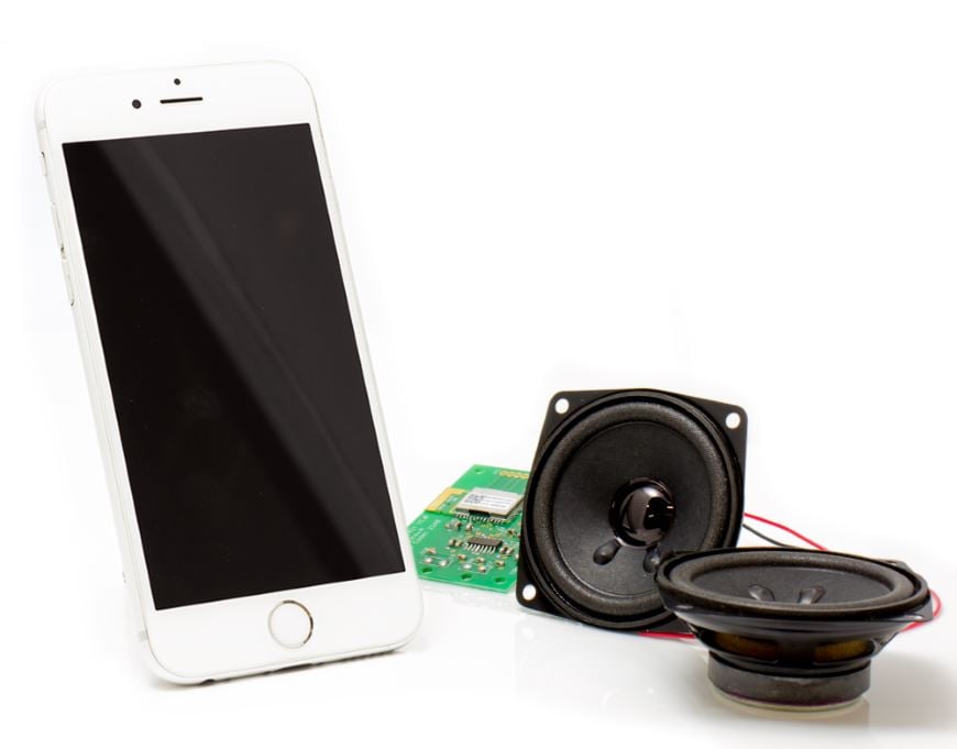 We wanted the kit to have an impressive sound quality so we opted for the PAM8008 which is also used in our 3W amplifier. There are many benefits of using this modern class-D amplifier, one is that the low working voltage (2.2V to 5.5V) means we can power the kit from microUSB, such as a mobile phone charger. It also lets us use an optional LiPo battery at 3.7V so the kit can be truly wireless!