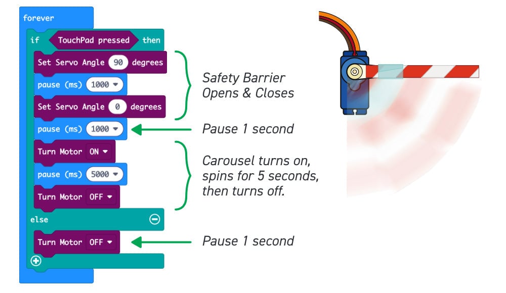Tape a small section of straw to the arm of your servo to act as a safety barrier. Then, amend your Carousel code as shown below.