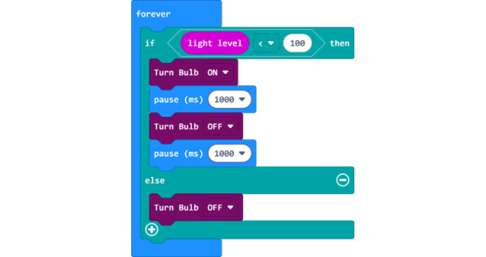 A: The micro:bit has LEDs that can also work as a light sensor. The amount of light is measured from 0 to 255. You will need to use an ‘if… else’ block and a comparison block for this.
