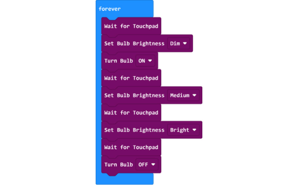 A: The Craft and Code board will wait until the touchpad is pressed. When the touchpad is pressed, the bulb will turn on, pause for 5000ms and then turn off.