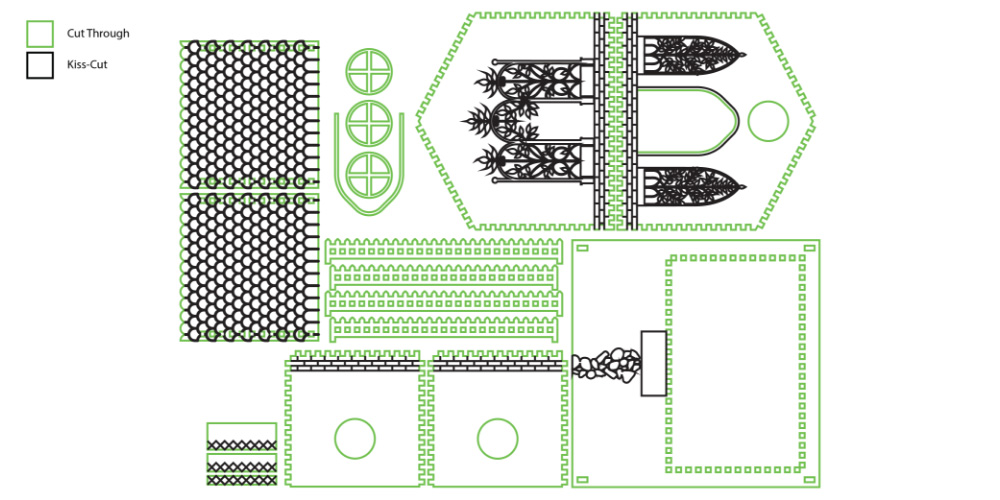 This design can tile two to a sheet of 600 x 400mm material. The black lines should be kiss-cut (a cut that doesn’t go all the way through the material), and then after that the green lines should be cut through all the way.