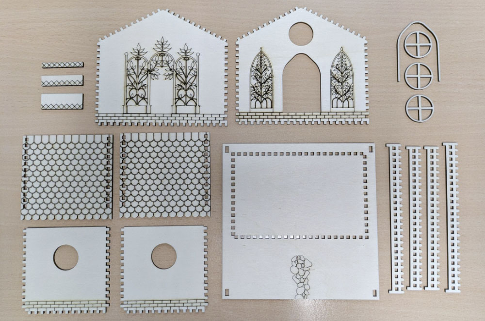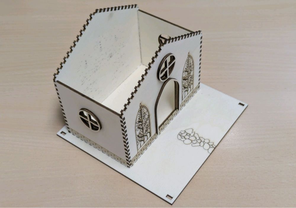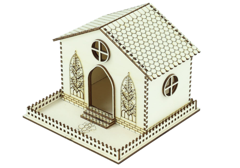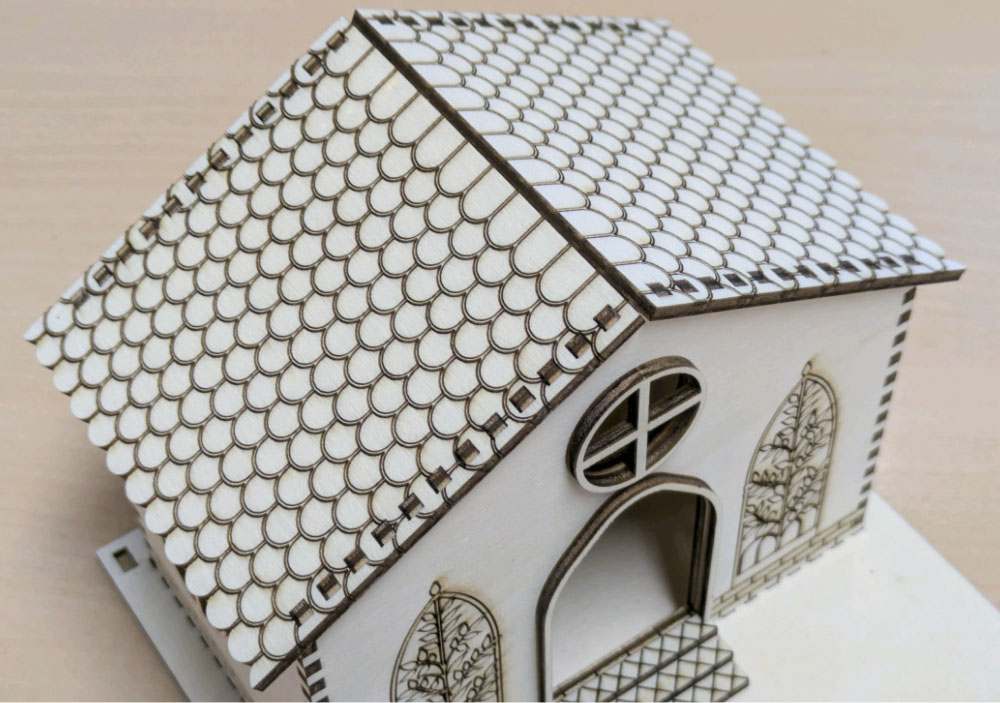 This project is a brilliant base for further customisation. Change the designs on the walls, scale it, make a bracket to affix it to a wall, or a loop to hang it from a tree. The bird house is made of B/BB grade Poplar Plywood, which is an unfinished wood that will need finishing before it is used outside. Consider how you will do this once you’ve made it – will you paint and lacquer it? Use a stain or a varnish? You have many options!
