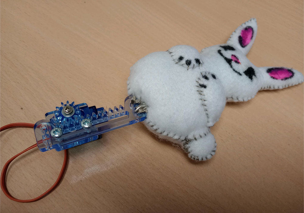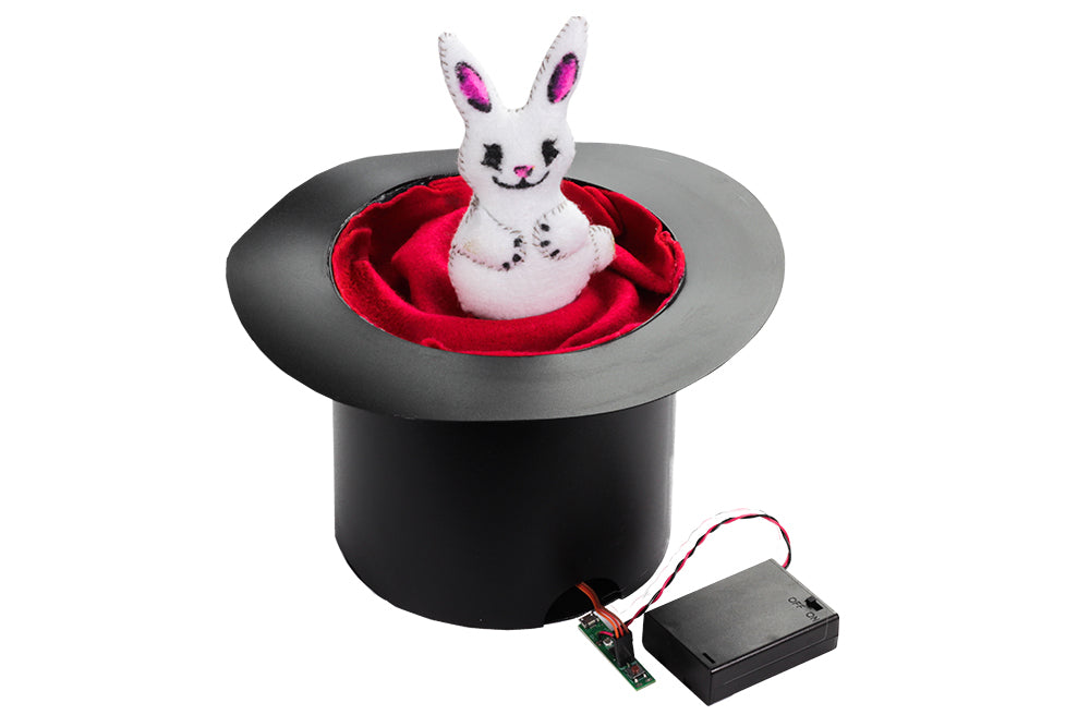 This adorable little plush rabbit is made from felt, coloured with markers and stuffed with cotton batting, and is a nice easy project in and of itself! Add in a linear actuator powered by our Movement Module, hide the battery box and linear actuator inside a top-hat, and you have an easy magic trick!