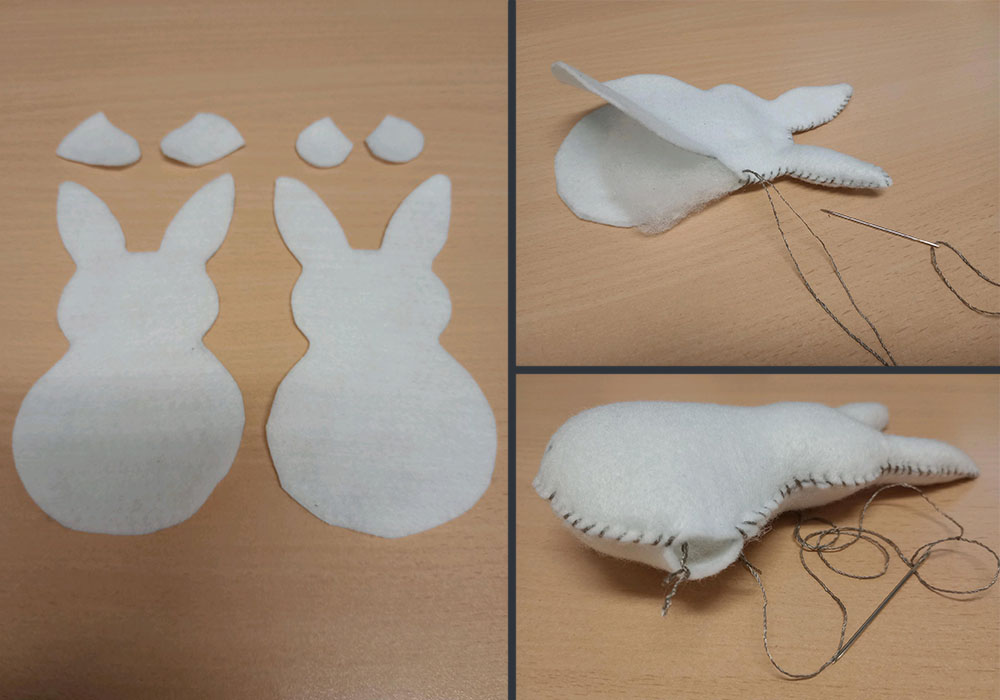 Cut out a rabbit shape in the size that you want, with little arms and a tail to sew on later. Sew the two sides together, pushing in stuffing as you go. Leave a small gap to insert the tail.