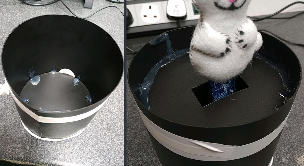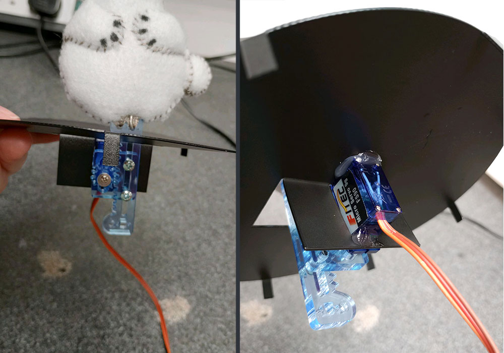 Attach the bunny to the middle platform of the hat by pushing the servo through the hole in the flap cut in the centre, and using an adhesive (I used hot glue) to secure the servo to the flap and to the bottom of the platform itself.