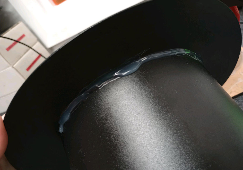 Glue on the brim! You can use hot glue as shown in the picture, or your choice of adhesive. You may choose to add tabs to the brim if you want to use tape to make securing it in place easier.