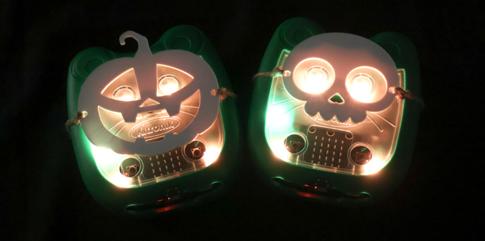 Mai-Z the MouseBot, our newest robot, loves to get a little spooky! We’ve made two cute Mai-Z sized masks, and coded up three micro:bits to have them sing together when the A button is pressed on a remote micro:bit.