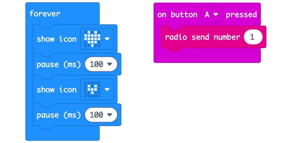To begin, we will be putting an incredibly simple piece of code on the micro:bit we’re using as the remote control. This will simply use the radio to send the number 1, when button A is pressed.