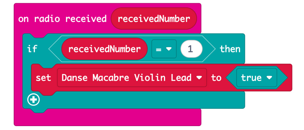 The code begins with an if statement, setting the variable for the violin lead to true if this micro:bit receives the number 1 from the remote control micro:bit.