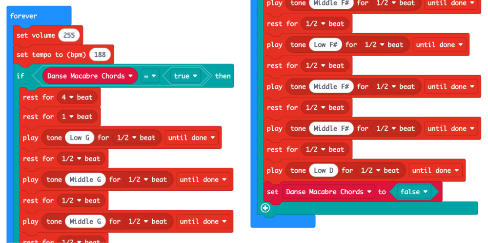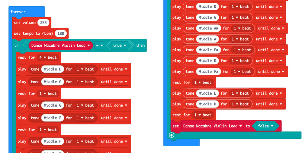 Then after this, inside a forever block, set the volume, tempo, and then define the variable by sequencing the song using the music blocks inside an if statement. At the end of the song, make sure to set the variable to false so that the music stops playing.