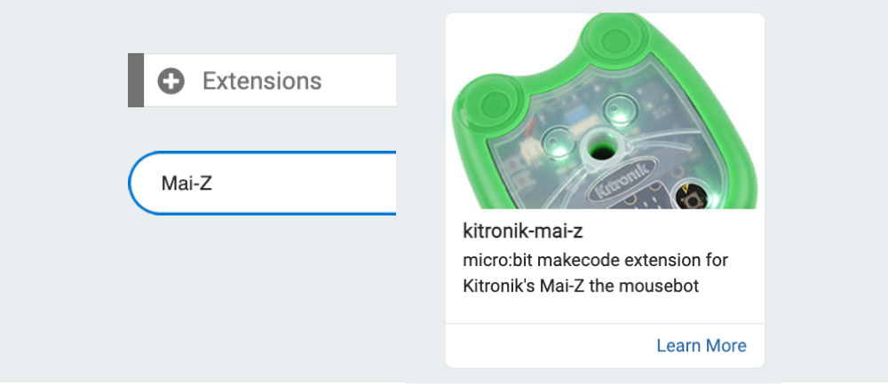 In order to import the custom Mai-Z blocks, press the “Extensions” tab in the code editor, type “Mai-Z” into the search bar, and click on the “kitronik-mai-z” extension.