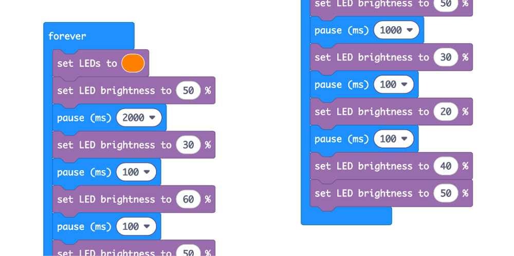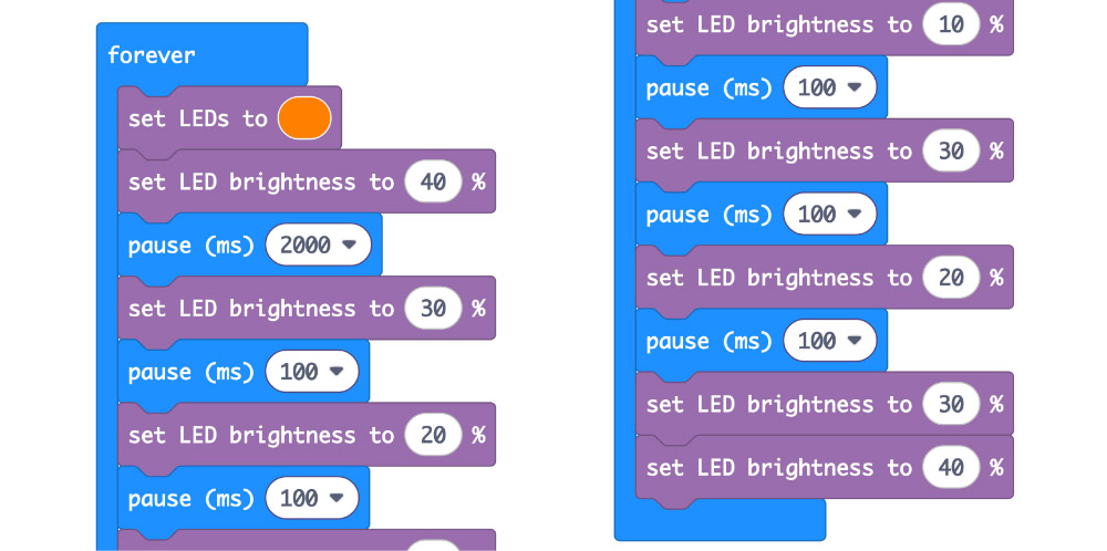 Using the custom Mai-Z blocks, vary the LED brightness, and pause for different amounts of time in between.