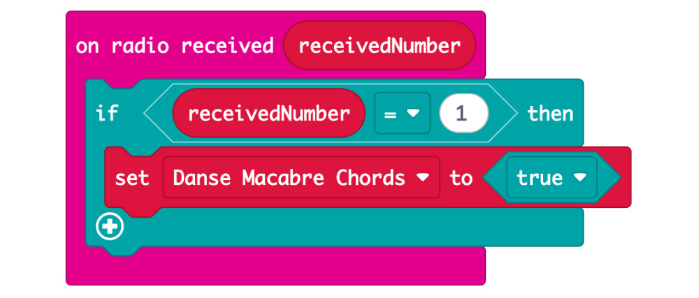 The code begins with the same if statement, setting the variable for the chords to true if this micro:bit receives the number 1 from the remote control micro:bit.