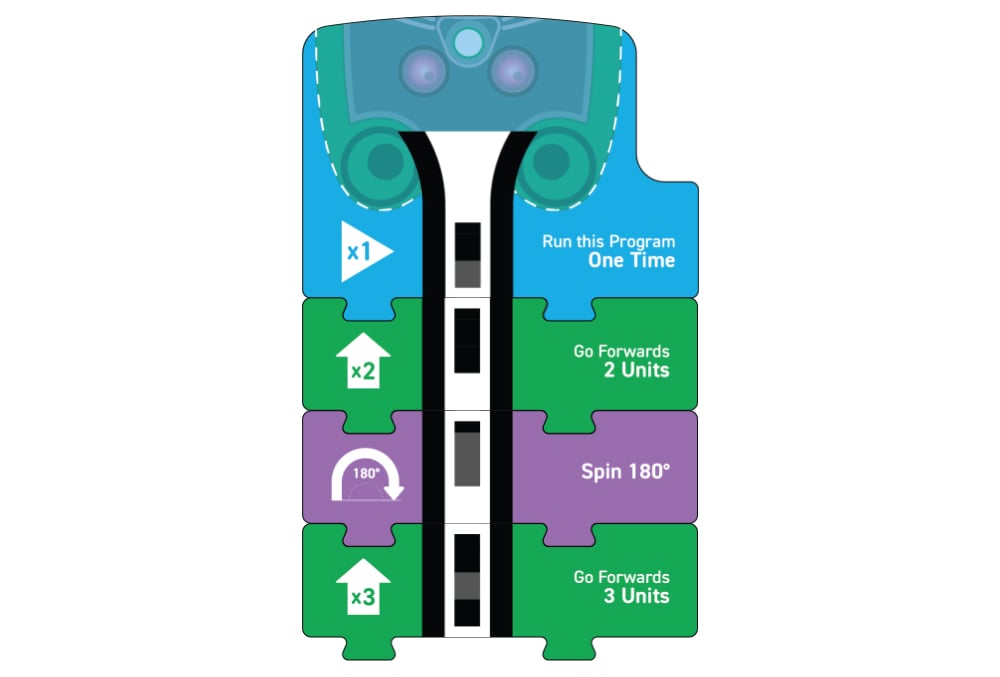 You need a start block, a ‘forwards x units’ block, a ‘spin 180°’ block, and the same ‘forwards x units’ block you started with.